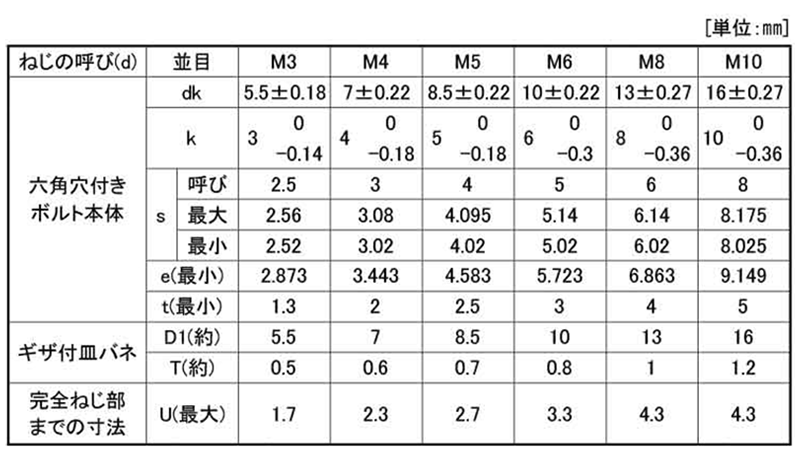鋼 10.9 六角穴付きボルト NHセーフティソケット ギザ付皿ばね組込(全ねじ)(日産ねじ製)