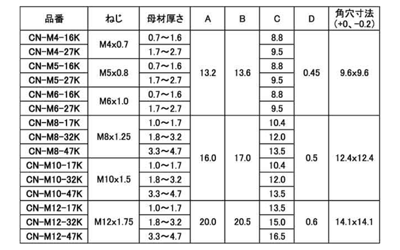 ステンレス ケージナット K型 (CN-K)(角穴はめ込み型ナット)