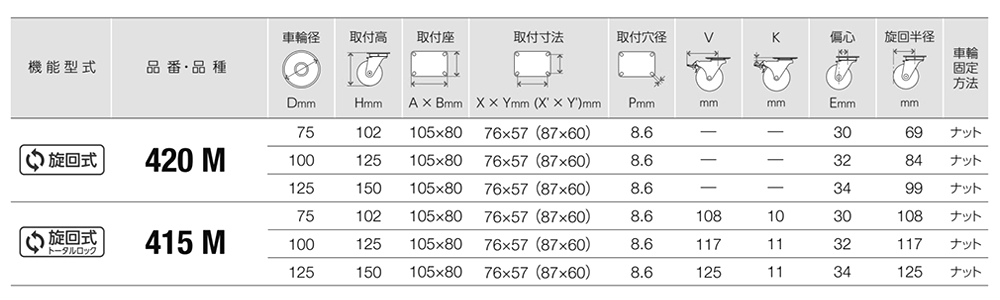 ハンマーキャスター415M (φ75~125)(プレート式・自在・トータルロック付)(三価)(取付座寸法-自在固定共通) の商品一覧