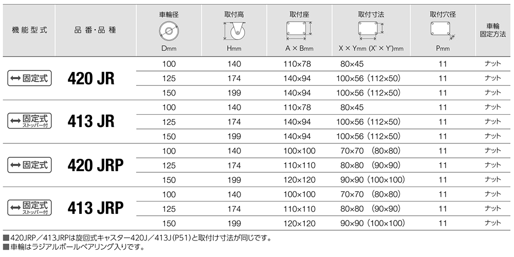 ハンマーキャスター 重荷重 413JR (φ100~150)(プレート式・固定・ストッパー付)(三価クロメート) の商品一覧