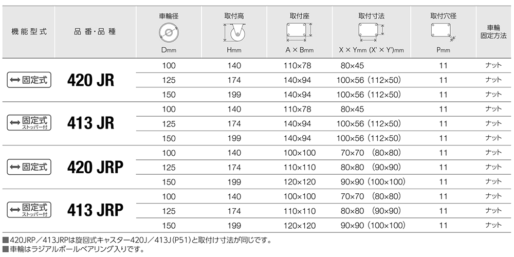 ハンマーキャスター 重荷重 413JRP (φ100~150)(プレート式・固定・ストッパー付)(三価クロメート) の商品一覧