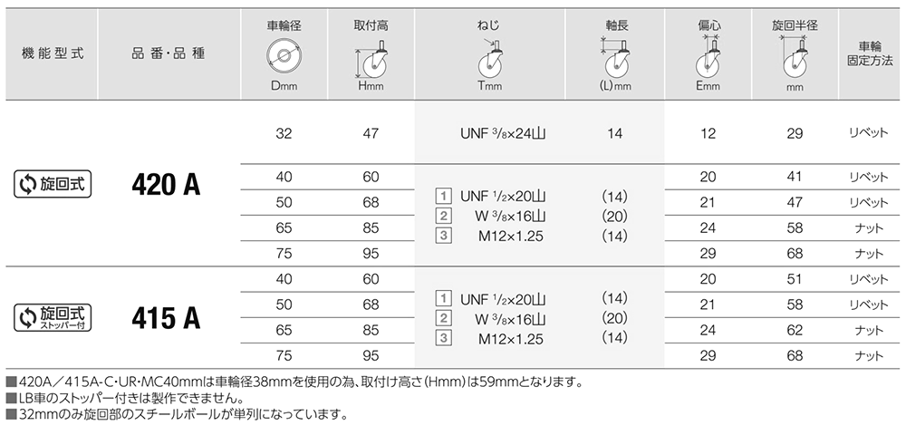 ハンマーキャスター 420A (φ32~75)(ねじ込み式・自在)(1=UNF・2=ウイット・3=ミリ細目)(三価クロメート)