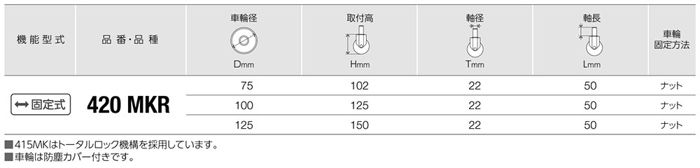 ハンマーキャスター420MKR (φ75~125)(差込式・固定・幅広車輪)(三価クロメート) の商品一覧
